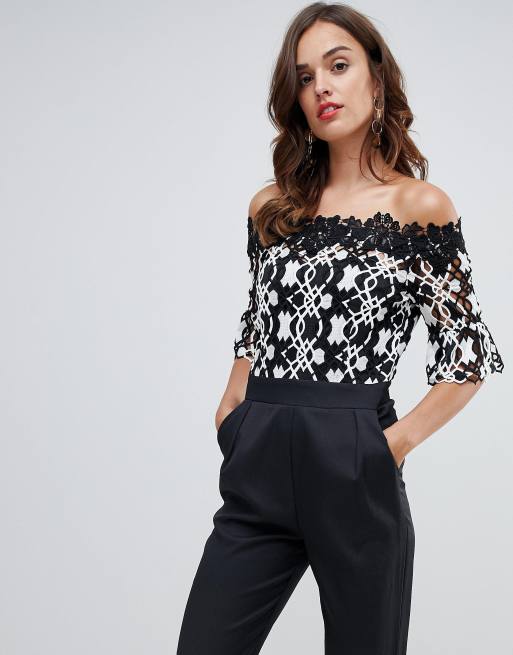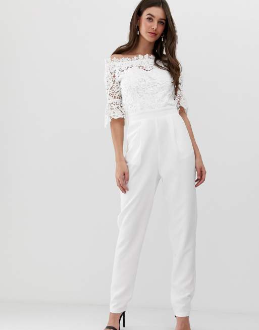 Shoptagr Paper Dolls Tall Bardot Cutwork Lace Tailored Jumpsuit In White By Paper Dolls