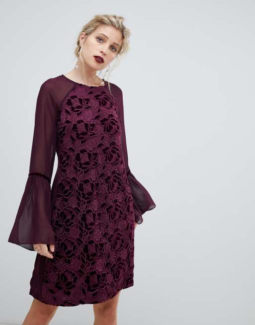 Paper Dolls Velvet Lace Shift Dress With Sheer Sleeve In Wine Asos